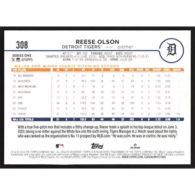 This is a 2024 Topps Reese Olson baseball card. The card is #308 and pictures show condition.