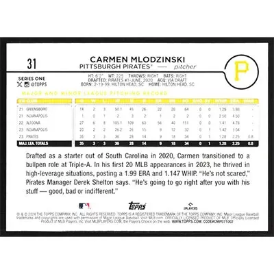 This is a 2024 Topps Carmen Mlodzinski baseball card. The card is #31 and pictures show condition.