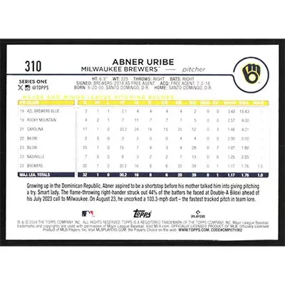 This is a 2024 Topps Abner Uribe baseball card. The card is #310 and pictures show condition.