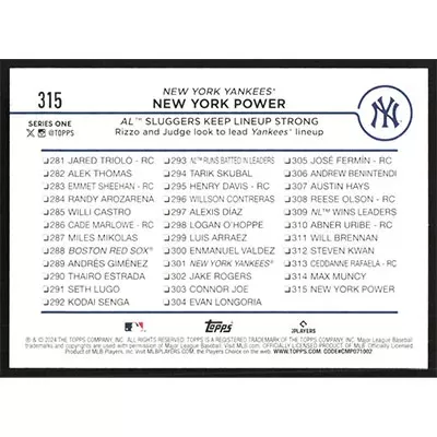 This is a 2024 Topps Anthony Rizzo and Aaron Judge Checklist baseball card. The card is #315 and pictures show condition. Team(s): New York Yankees