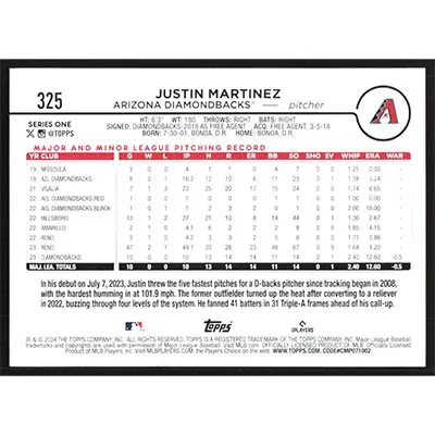 This is a 2024 Topps Justin Martinez baseball card. The card is #325 and pictures show condition.