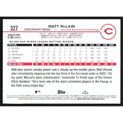 This is a 2024 Topps Matt McLain baseball card. The card is #327 and pictures show condition.