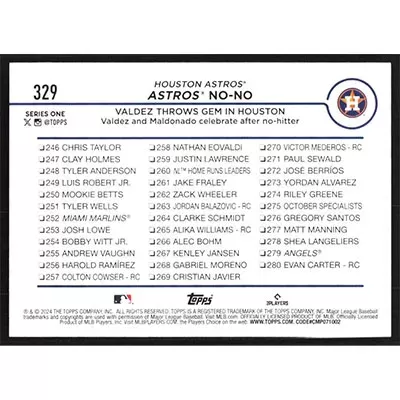 This is a 2024 Topps Framber Valdez and Martin Maldonado Checklist baseball card. The card is #329 and pictures show condition. Team(s): Houston Astros