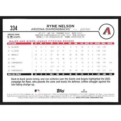 This is a 2024 Topps Ryne Nelson baseball card. The card is #334 and pictures show condition.