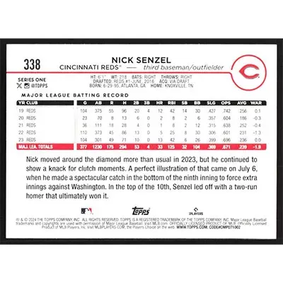 This is a 2024 Topps Nick Senzel baseball card. The card is #338 and pictures show condition.