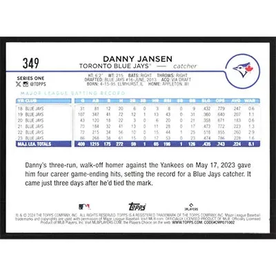 This is a 2024 Topps Danny Jansen baseball card. The card is #349 and pictures show condition.