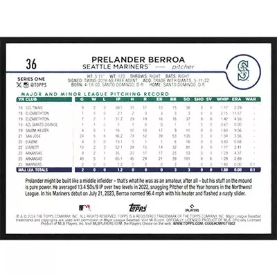 This is a 2024 Topps Prelander Berroa baseball card. The card is #36 and pictures show condition.
