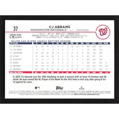 This is a 2024 Topps CJ Abrams baseball card. The card is #37 and pictures show condition.