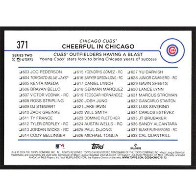 This is a 2024 Topps Pete Crow-Armstrong and Seiya Suzuki Checklist Cheerful in Chicago baseball card. The card is #371 and pictures show condition. Team(s): Chicago Cubs