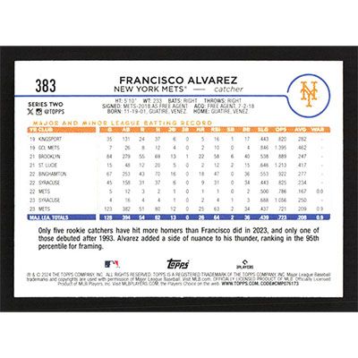 This is a 2024 Topps Francisco Alvarez Future Stars baseball card. The card is #383 and pictures show condition.