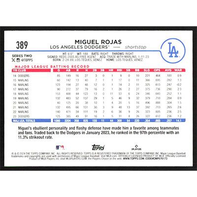 This is a 2024 Topps Miguel Rojas baseball card. The card is #389 and pictures show condition.