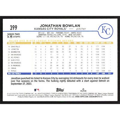 This is a 2024 Topps Jonathan Bowlan baseball card. The card is #399 and pictures show condition.