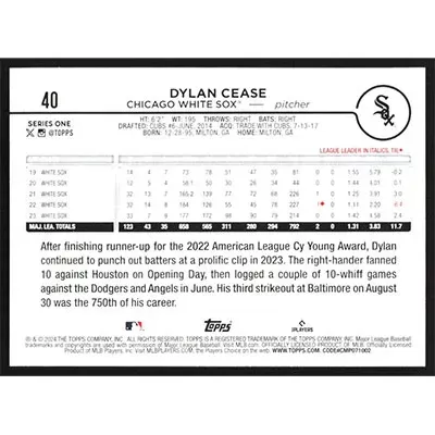 This is a 2024 Topps Dylan Cease baseball card. The card is #40 and pictures show condition.