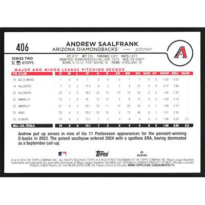 This is a 2024 Topps Andrew Saalfrank baseball card. The card is #406 and pictures show condition.