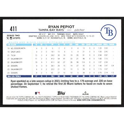 This is a 2024 Topps Ryan Pepiot baseball card. The card is #411 and pictures show condition.