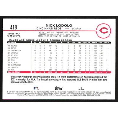 This is a 2024 Topps Nick Lodolo baseball card. The card is #418 and pictures show condition.