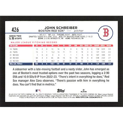 This is a 2024 Topps John Schreiber baseball card. The card is #426 and pictures show condition.