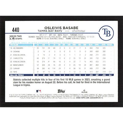 This is a 2024 Topps Osleivis Basabe baseball card. The card is #440 and pictures show condition.