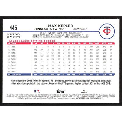 This is a 2024 Topps Max Kepler baseball card. The card is #445 and pictures show condition.