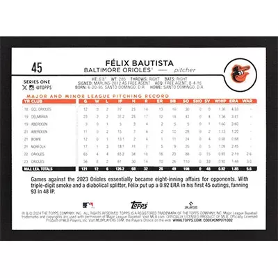 This is a 2024 Topps Felix Bautista baseball card. The card is #45 and pictures show condition.