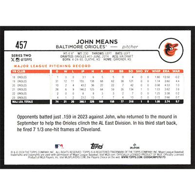 This is a 2024 Topps John Means baseball card. The card is #457 and pictures show condition.
