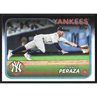 This is a 2024 Topps Oswald Peraza baseball card. The card is #459 and pictures show condition.