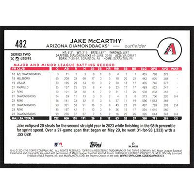 This is a 2024 Topps Jake McCarthy baseball card. The card is #482 and pictures show condition.
