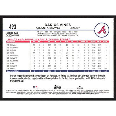 This is a 2024 Topps Darius Vines baseball card. The card is #493 and pictures show condition.