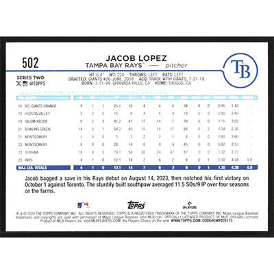 This is a 2024 Topps Jacob Lopez baseball card. The card is #502 and pictures show condition.