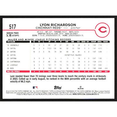 This is a 2024 Topps Lyon Richardson baseball card. The card is #517 and pictures show condition.