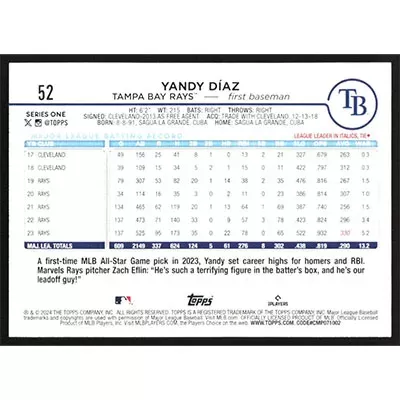This is a 2024 Topps Yandy Diaz baseball card. The card is #52 and pictures show condition.