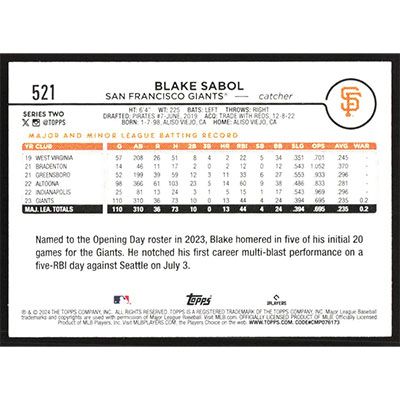 This is a 2024 Topps Blake Sabol baseball card. The card is #521 and pictures show condition.