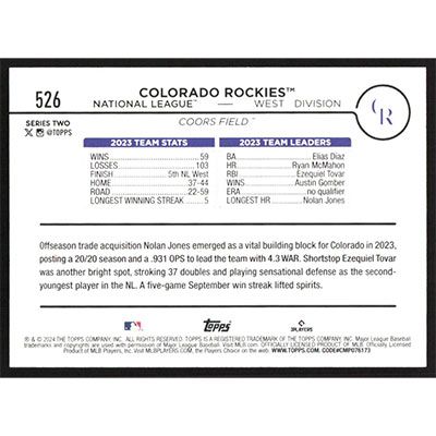 This is a 2024 Topps Colorado Rockies Team Card baseball card. The card is #526 and pictures show condition.