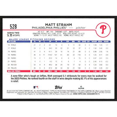 This is a 2024 Topps Matt Strahm baseball card. The card is #528 and pictures show condition.