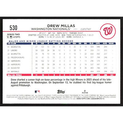 This is a 2024 Topps Drew Millas baseball card. The card is #530 and pictures show condition.