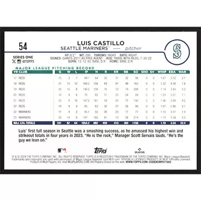 This is a 2024 Topps Luis Castillo baseball card. The card is #54 and pictures show condition.