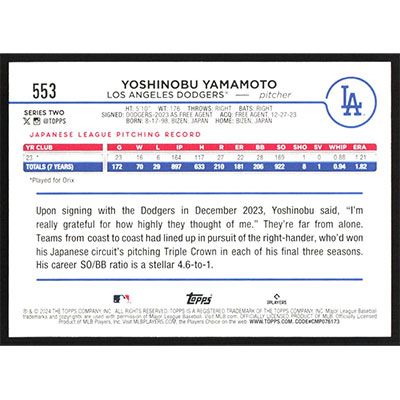 This is a 2024 Topps Yoshinobu Yamamoto baseball card. The card is #553 and pictures show condition.