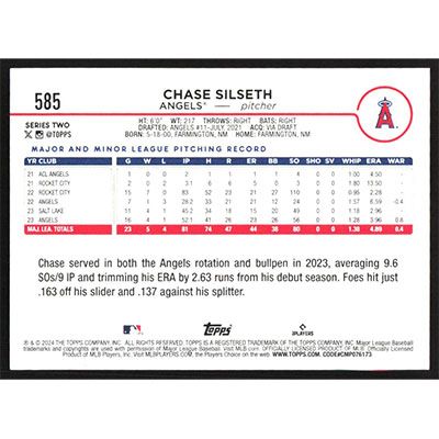 This is a 2024 Topps Chase Silseth baseball card. The card is #585 and pictures show condition.