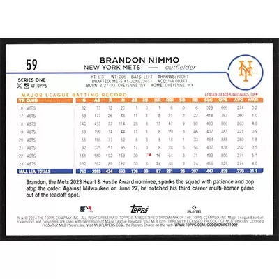 This is a 2024 Topps Brandon Nimmo baseball card. The card is #59 and pictures show condition.