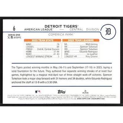 This is a 2024 Topps Detroit Tigers baseball card. The card is #6 and pictures show condition.