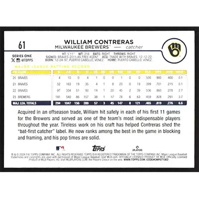 This is a 2024 Topps William Contreras baseball card. The card is #61 and pictures show condition.