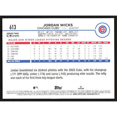 This is a 2024 Topps Jordan Wicks baseball card. The card is #613 and pictures show condition.
