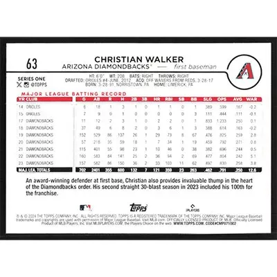 This is a 2024 Topps Christian Walker baseball card. The card is #63 and pictures show condition.