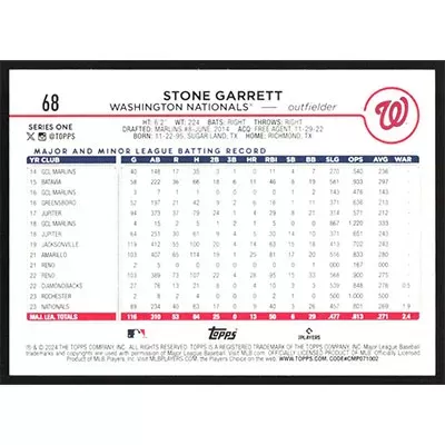 This is a 2024 Topps Stone Garrett baseball card. The card is #68 and pictures show condition.