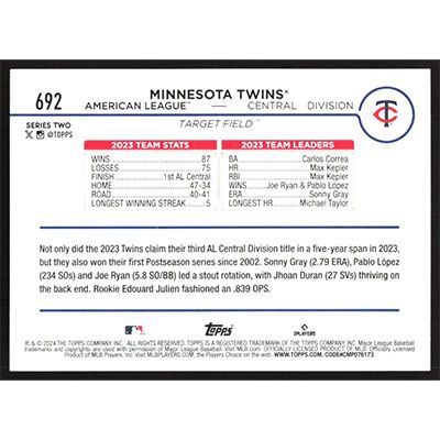 This is a 2024 Topps Minnesota Twins Team Card baseball card. The card is #692 and pictures show condition.