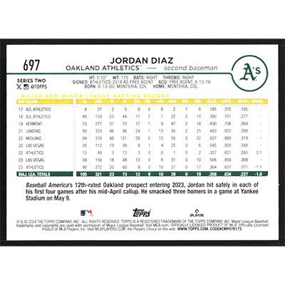 This is a 2024 Topps Jordan Diaz baseball card. The card is #697 and pictures show condition.
