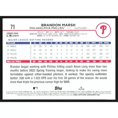 This is a 2024 Topps Brandon Marsh baseball card. The card is #71 and pictures show condition.