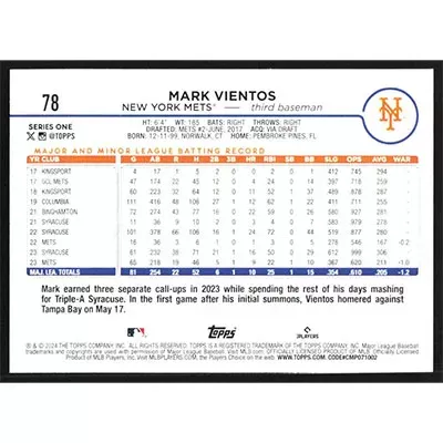 This is a 2024 Topps Mark Vientos baseball card. The card is #78 and pictures show condition.