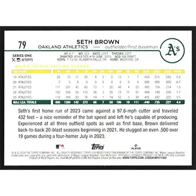 This is a 2024 Topps Seth Brown baseball card. The card is #79 and pictures show condition.
