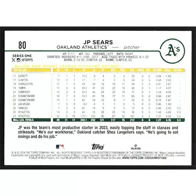This is a 2024 Topps JP Sears baseball card. The card is #80 and pictures show condition.